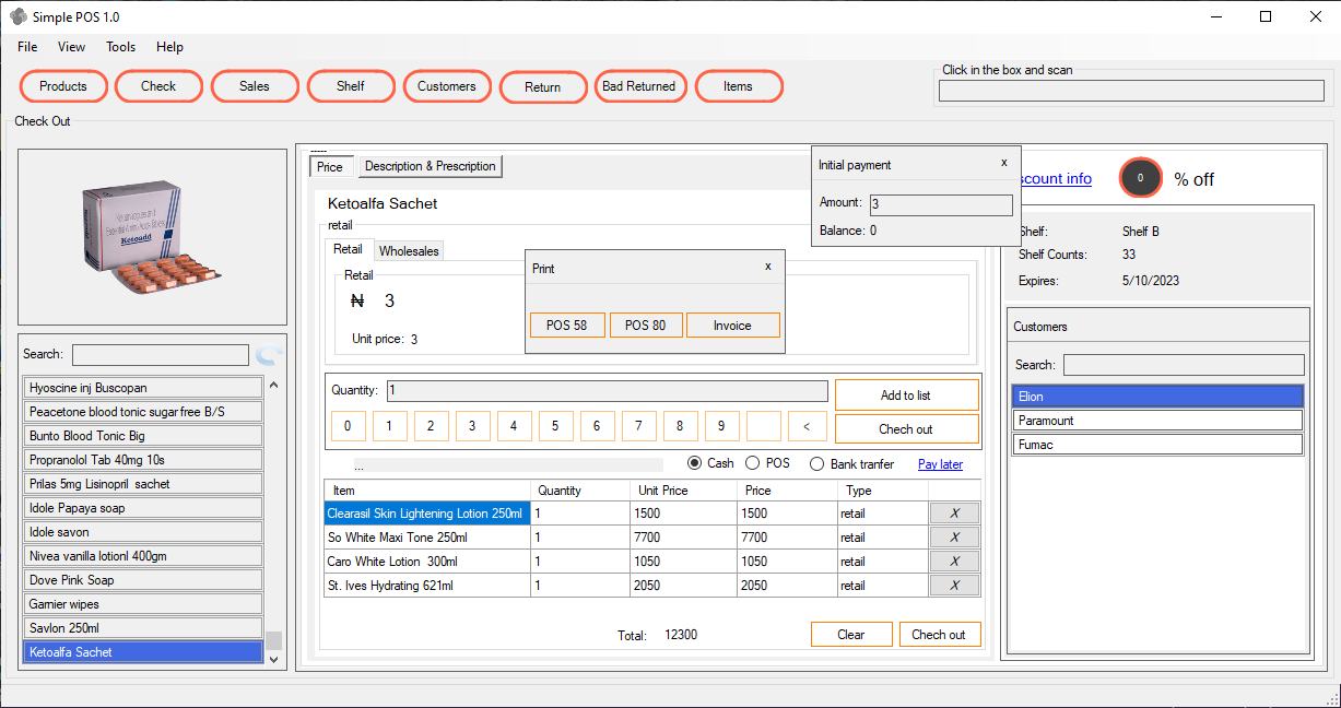 World best point of sales application, fast, and user friendly, Manage Stock (Shelf items), Manage checkout and returns, manages both retail and wholesales stock. Offers cheap and fast door to door delivery.